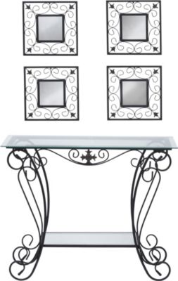 This beautiful metal and glass console table is the perfect decorative accent for hallways living rooms and dining rooms. A clear glass top sits upon the delicate detailing and elegant swirls of the black frame. The table is lovely by itself or adorned with floral arrangements and keepsakes. Metal frame with black powder coating5mm tempered glass tabletop Approx. 29" x 14" x 36"Includes 4 mirrors; 61/4"W x 61/4H" each Includes hanging screws and wall anchors Read more
